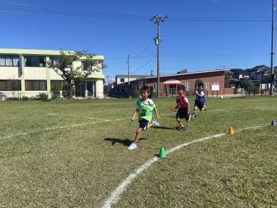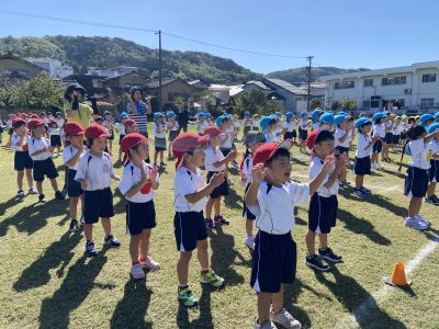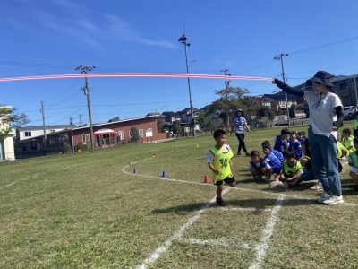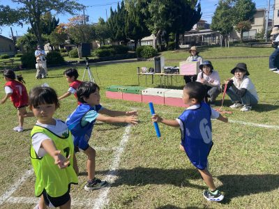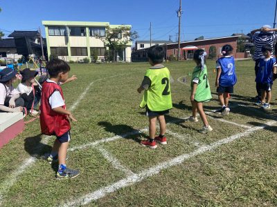 そしてリレー。年長4チーム「赤」「青」「黄」「緑」の4チームで競う。
